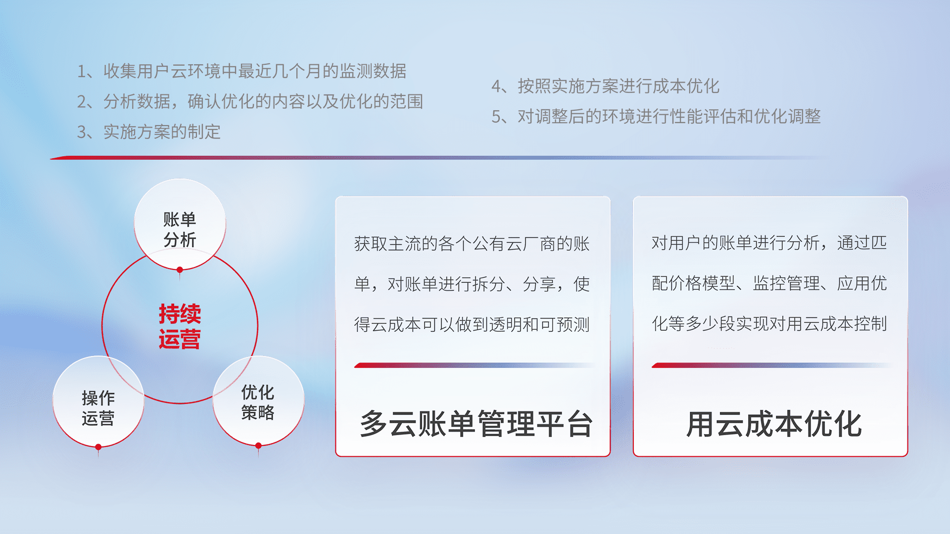 通过多云纳管,,以统一的资源数据模型把客户的云资源进行抽象和封装,,,进而实现对多云资源的统一操作,,保障云资源管理的可靠性、、稳定性与可用性。。量身定制化运维内容,,,配置、、、、开发运维、、补丁管理、、备份、、、、监控、、、、认证和访问管理、、、、审计和日常巡检等,,保障在用云过程中的可靠度,,,,稳定度以及高可用率。。。